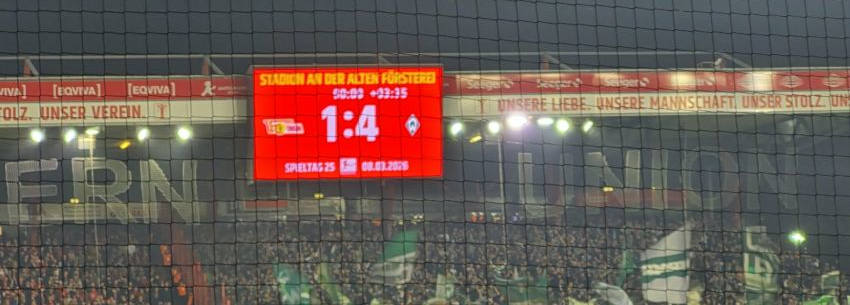 Im Freitagspiel der Bundesliga empfing SV Werder Bremen unseren 1. FC Union Berlin. Unioner stürmten vor, waren gefährlicher als der Gegner, doch ohne Treffer. Eine Verletzung in Minute 29 zeigte Wirkung. Werder erhöhte den Druck, lief fast in einen „tödlichen“ Konter – und traf, kein Punkt an der Weser. Weiterlesen ...